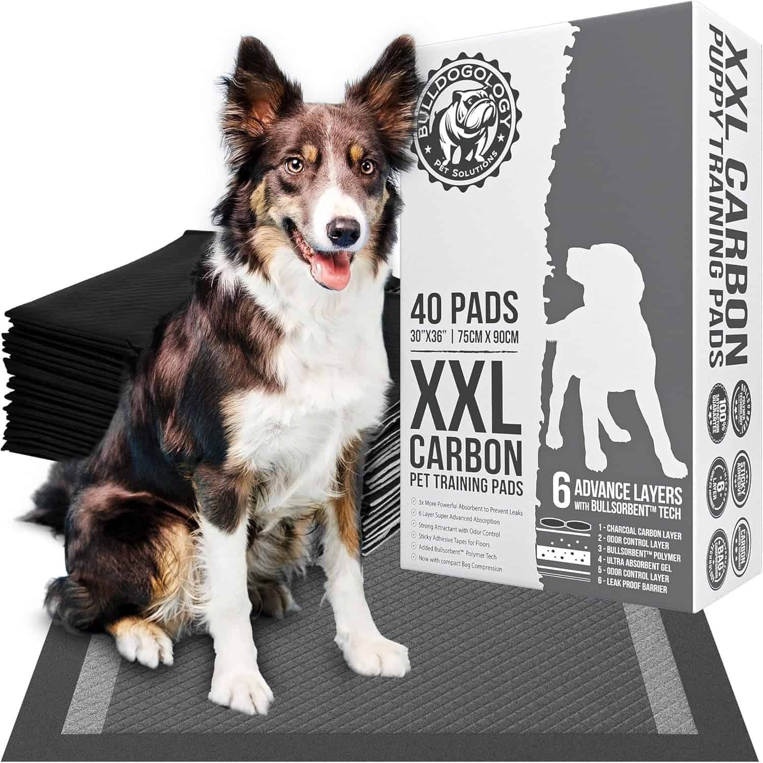 - 6 LAYER, 3x THICKER: NEW 40 Count XX-Large 30×36 Carbon Activated Charcoal Puppy Pee Pads with Bullsorbent Polymer Tech that instantly absorbs faster and turns liquid into gel, keeping floors, tiles, or carpets quickly dry